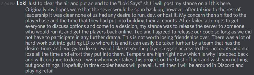 What we had discussed before this:[8:04 PM] Loki: Just to clear the air and put an end to the "Loki Says" shit i will post my stance on all this here. Originally my hopes were that the sever would be spun back up, however after talking to the rest of leadership it was clear none of us had any desire to run, dev, or host it. My concern then shifted to the playerbase and the time that they had put into building their accounts. After failed attempts to get everyone to discuss options and come to a desicion, my stance was to release the server to someone who would run it, and get the players back online. Teo and I agreed to release our code so long as we did not have to participate in any further drama. This is not worth losing friendships over. There was a lot of hard work put into getting LD to where it is and it can easily be taken furhter by a team that has the desire, time, and energy to do so. I would like to see the players regain access to their accounts and not lose all the time and effort they put into them. Tempers are high right now which is why i stepped back and will continue to do so. I wish whomever takes this project on the best of luck and wish you nothing but good things. Hopefully in time cooler heads will prevail. Until then I will be around in Discord and playing retail.