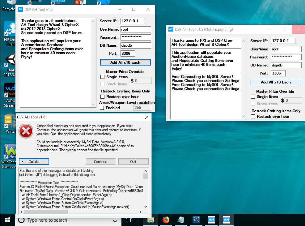 Most of my efforts were using v1.5, but it would lock up for a long time and throw an error telling me it cant connect. So i tried 1.6 and it locks up forever, the app never unlocks, and nothing is put into the AH.