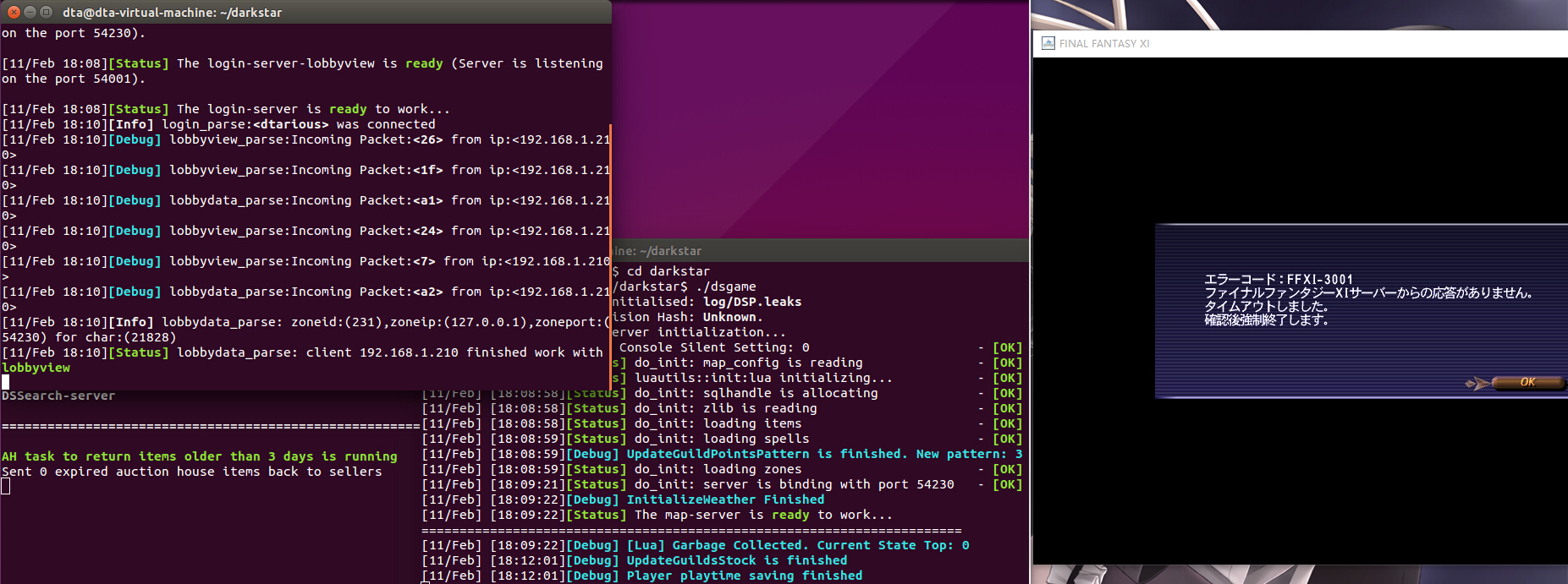 I built my server on virtual machine. OS is Ubuntu 15.04 . I downloaded all the stuff and make them work well. but always get the error code ffxi-3001.I tried to wait for 5 minutes and log in again .but still error. how can I fix this problem?